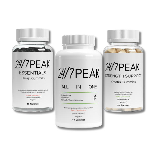 Schluss mit Müdigkeit, Stress und unzähligen Pillen. 24/7 PEAK vereint Shilajit, Kreatin & essentielle Vitamine – für mehr Energie, Fokus und Balance im Alltag.